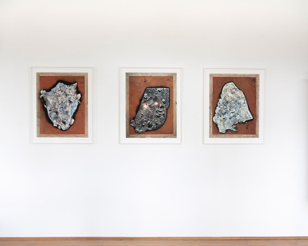 Hutgens geht es aber nicht einfach darum, das Urphänomen von Materialentstehung aufzugreifen, sondern zugleich seine Rückwirkung auf unsere eigenen Leiberfahrungen deutlich zu machen. Denn der menschliche Körper wird dann zum Leib, wenn er sich fühlend auf seine Umgebung einlässt. Die taktile Rückwirkung ist bei allen Gebilden von Hutgens bedeutsam. In gleicher Weise betrifft dies auch den visuellen Bereich. Daher benutzt Hutgens immer wieder die Fotografie als visuellen Anker im Dahin- und Forttreiben des Materialverhaltens. Die Fotografie entkleidet er aber ihrer vermeintlichen distanzierten Neutralität und benutzt ihre eigene sensible Prozesshaftigkeit unterschiedlichen Emulsions- und Entwicklungsverhaltens zur Mitwirkung an seinen Arbeiten. Hutgens’ neugieriges und forschendes Verhalten belebt dabei scheinbar längst vergangene Techniken wie den Gummidruck. Ihn interessiert auch der mediale Transfer, der mit der Produktion von Bildern im Kontrast zur Produktion von Gebilden einhergeht. Außerdem dient ihm das Medium dazu, sich aus dem Mitgerissenwerden von den Materialveränderungen zu befreien und an sich selbst zu beobachten, in was er sich von der Logik des Materials hat hereinreißen lassen. In seinen Gebilden widmet sich Hutgens auch der Thematik der Gelenkstellen, der heiklen Verbindungen des Materials miteinander oder ihres Überganges ineinander. Wie lässt es sich fassen, wie kann es Verknüpfungen eingehen, in welche Umgebung sich einfinden, wie kann es stehen oder hängen und damit Umgebungen umdefinieren?