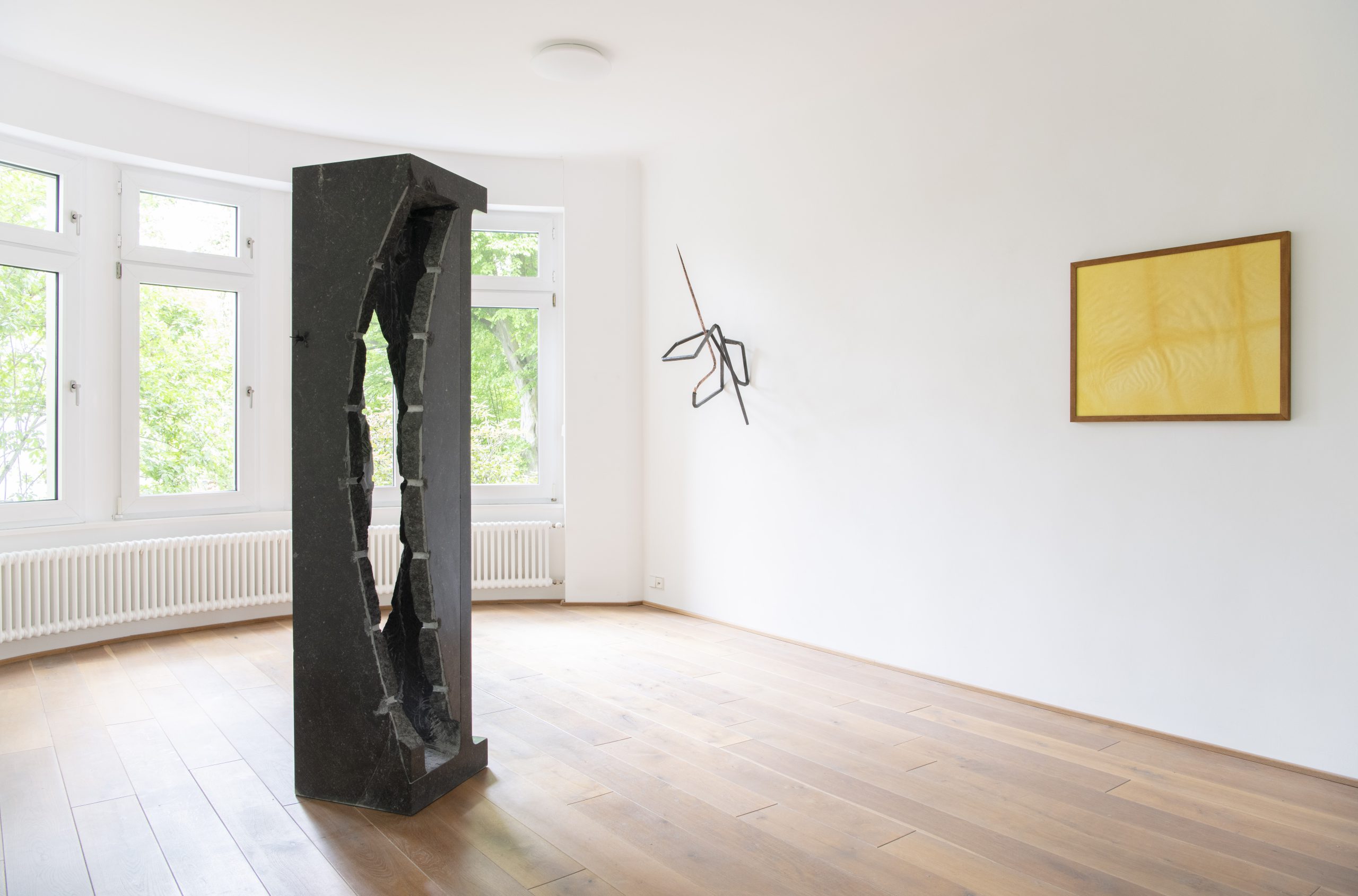 links: In between, 2022, Belgisch Granit, geschmiedeter Stahl, 202 x 48 x 45 cm
